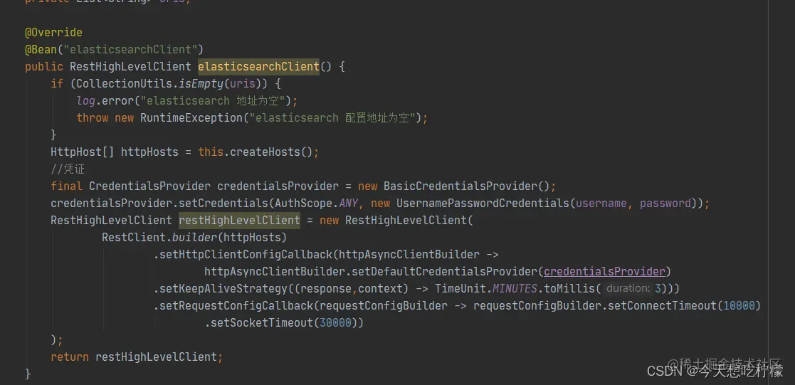 此外我们通常会使用spring框架来整合这些中间件服务。由于我们的elasticsearch加了账号密码。我们需要在代码中配置。