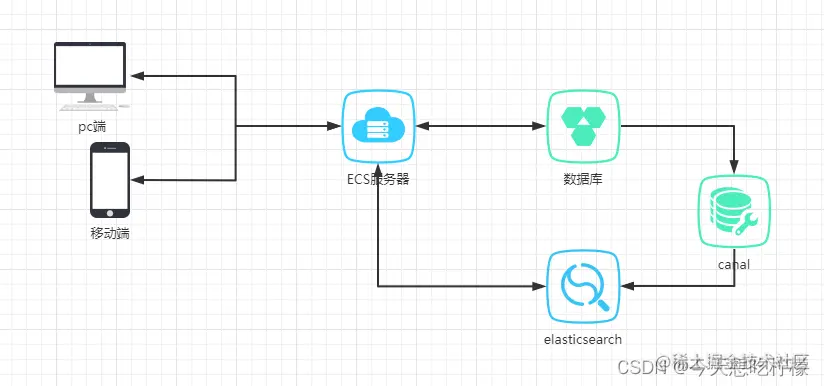 这个时候问题来了,在现有服务的存储环境主要是mysql的前提下如何把搜索服务交给ES来进行处理,那么就需要将mysql中的数据同步到ES中,并且这种同步操作应该是异步不影响原先服务运行的。我们采用的方案是使用阿里的canal搭建一个主从复制架构,将mysql的数据同步过来到ES,然后ES提供搜索服务