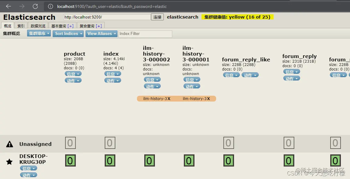 然后我们访问elasticsearch-head,在浏览器中输入elasticsearch-head服务地址加9100端口后面跟上用户名和密码,例如