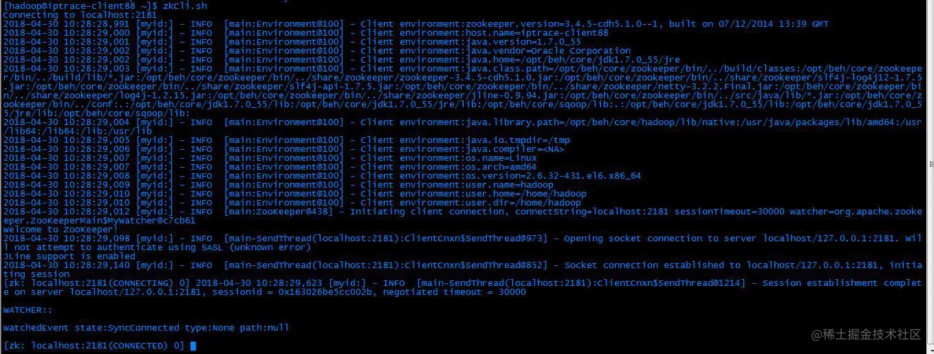 在 10.161.XX.XX 上用 hadoop 用户执行zkCli.sh,进入zookeeper 的shell 环境。
