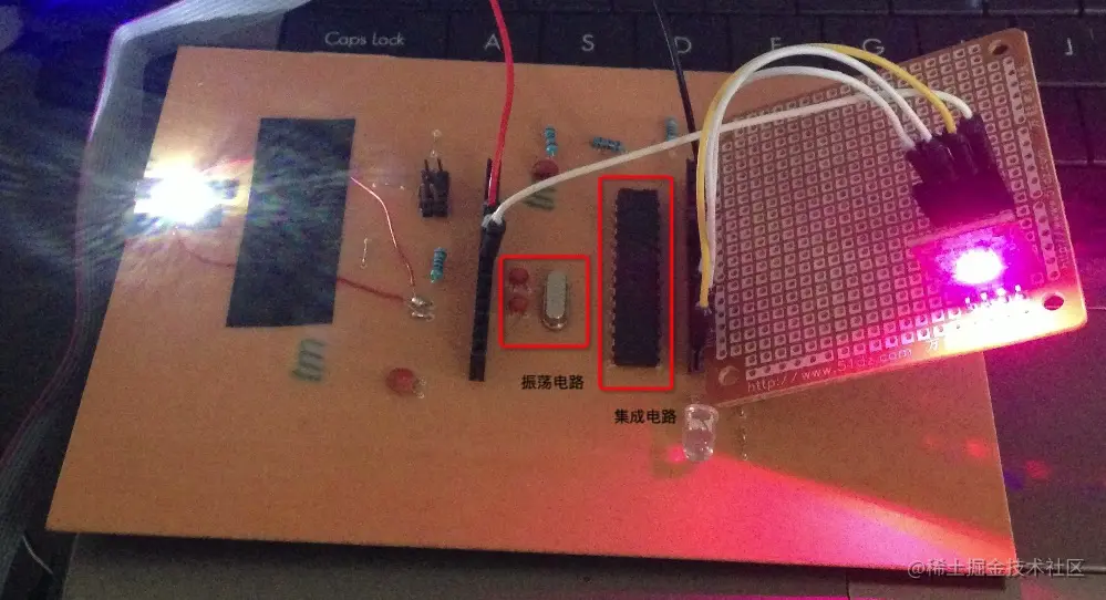 如图 4-44 就是一个在香农启发下产生的数字电路,Theseus 中古老的电子元器件已经变成了右侧红框的集成电路。通过将两个电容和一个晶振组成左侧红框的振荡电路,给集成电路提供时钟。集成电路上有数模转换电路,把高低电平代表的布尔代数运算电路计算结果转换成模拟信号输出,可调光调色的 LED 模组上就产生了功率输出的不同:颜色、频率输出的不同:亮度。在香农的启发和帮助下,图 4-44 的电路实现了一个完整的程序功能:随时钟变化不断改变 LED 颜色和亮度。