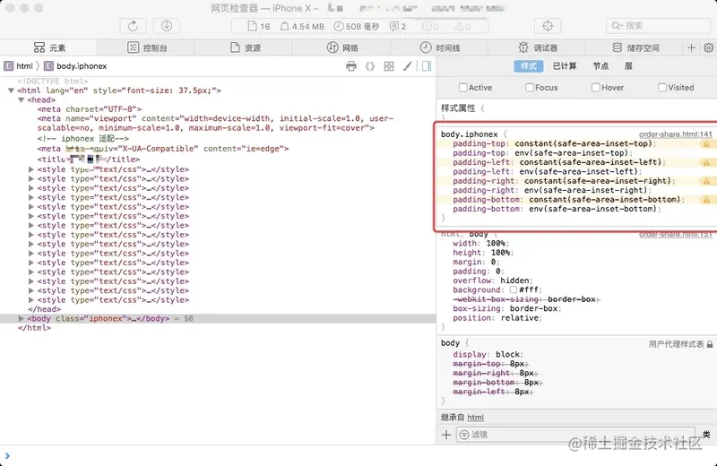 env 和 constant 只有在 viewport-fit=cover 时候才能生效, 上面使用的safari 的控制台可以检测模拟器中网页开启web inspector.