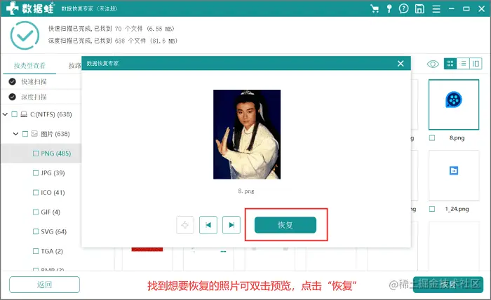 第3步:待扫描完成,在扫描出来的结果里找到你想恢复的文件类型,本文主题为图片,那么下面以图片为例,而且大部分图片可以清晰预览哦!最后点击“恢复”。