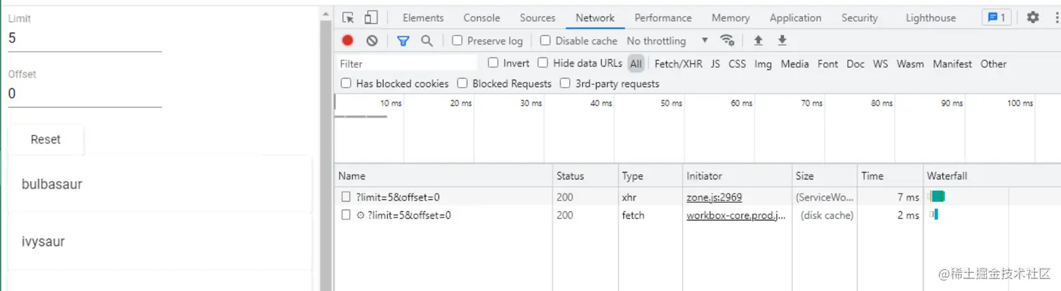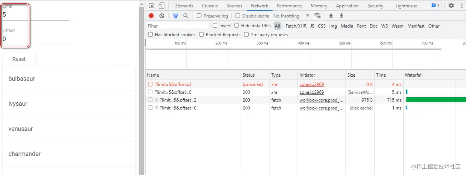 当我修改 limit 和 offset 为其他值之后,点击 reset 按钮,此时会观察到先后发起两个请求,并且第一个请求自动被 cancel 的情况: