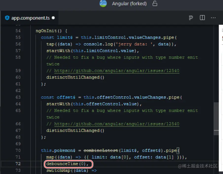 为此,我们可以在 combineLatest 之后直接利用值为 0 的 debounceTime。 这将确保只有最后一个值被传递给 switchMap,并且在调用堆栈被清除之后。