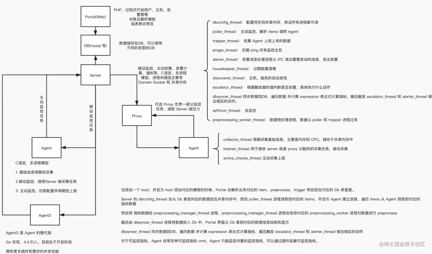 - Server 的 dbconfig_thread 会从 Db 拿到对应的数据放在共享内存中,然后poller_thread 进程读取到对应的 items,开启与 Agent 建立连接,遍历 items 从 Agent(snmp,简单检查 等) 获取到对应的指标数据
