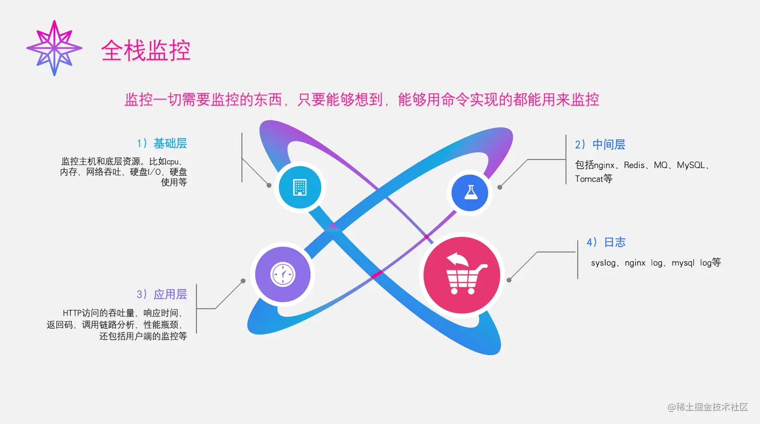 应用层: HTTP访问的吞吐量、响应时间、 返回码、调用链路分析、性能瓶颈, 还包括用户端的监控等