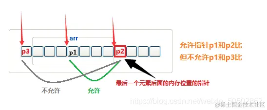 🔑 解析:标准规定:允许指向数组元素的指针与指向数组最后一个元素后面的拿个内存位置的指针比较,但是不允许与指向第一个元素之前的拿个内存位置的指针进行比较;