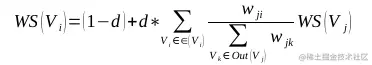 TextRank 一般模型可以表示为一个有向有权图 G =(V, E), 由点集合 V和边集合 E 组成, E 是V ×V的子集。图中任两点 Vi , Vj 之间边的权重为 wji , 对于一个给定的点 Vi, In(Vi) 为 指 向 该 点 的 点 集 合 , Out(Vi) 为点 Vi 指向的点集合。点 Vi 的得分定义如下: