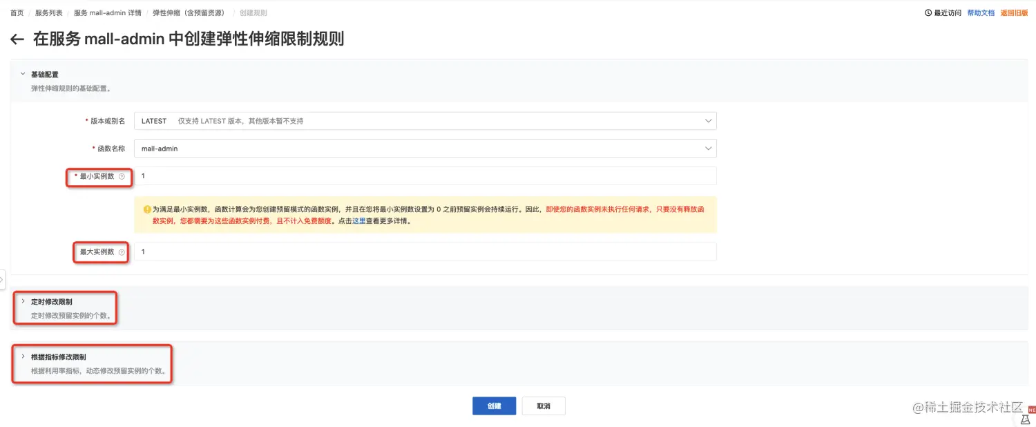 用户在控制台中配置最小和最大实例数。平台会预留最小实例数目的实例,最大实例是指该函数下实例的上限。用户也可以设置定时预留和按指标预留的规则。