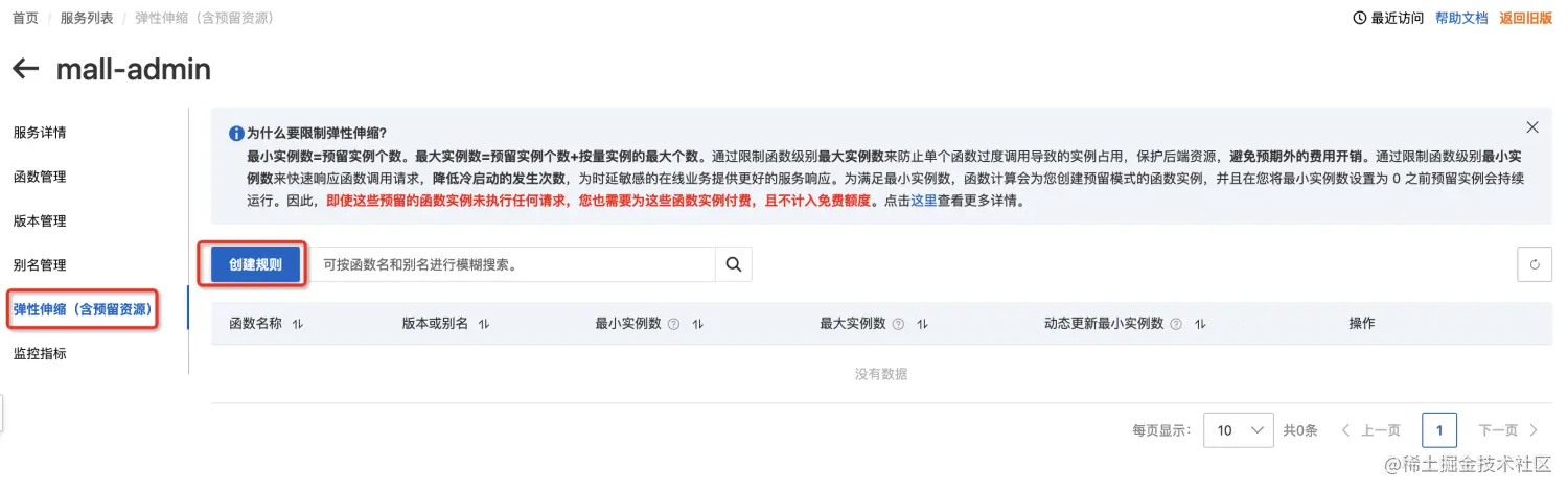 在函数计算控制台,我们可以在“弹性伸缩”页面为函数设置预留实例。