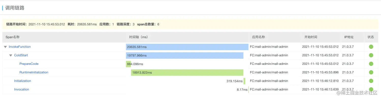 调用链路会显示冷启动各个环节的耗时。冷启动包含以下几个环节: