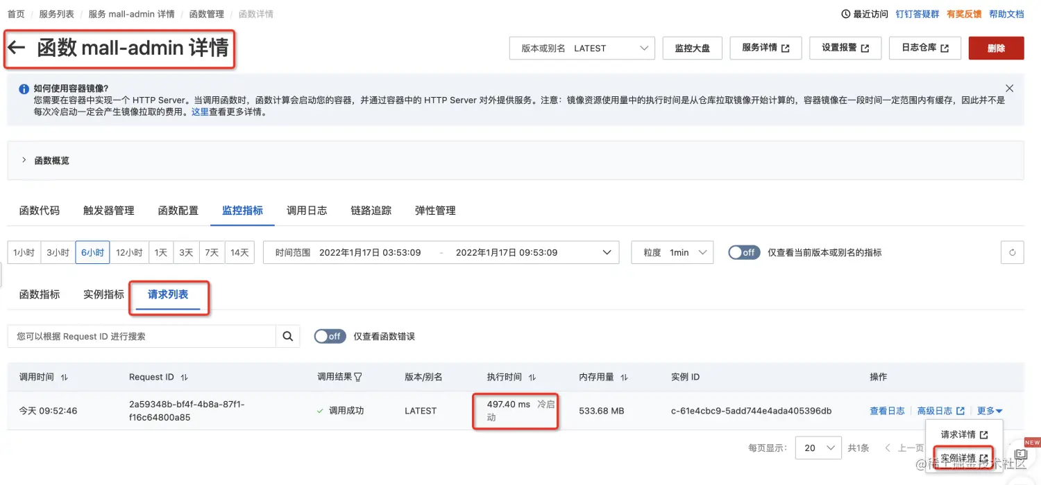 对 mall-admin 服务发起请求,成功后查看 FC 控制台,我们能够看到相应的请求信息。注意关闭“仅查看函数错误”,这样才会显示所有请求。指标监控和调用链路数据收集会存在一定延时,如果没有显示,请等待一会再刷新。找到冷启动标记的请求,点击 “更多” 下的 “请求详情”。