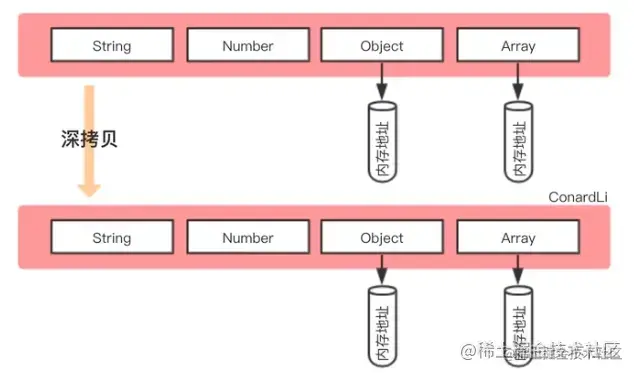 - 深拷贝是将一个对象从内存中完整的拷贝一份出来,从堆内存中开辟一个新的区域存放新对象,且修改新对象不会影响原对象。