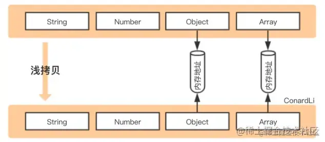 - 浅拷贝是创建一个新对象,这个对象有着原始对象属性值的一份精确拷贝。如果属性是基本类型,拷贝的就是基本类型的值,如果属性是引用类型,拷贝的就是内存地址 ,所以如果其中一个对象改变了这个地址,就会影响到另一个对象。