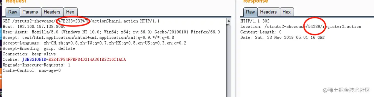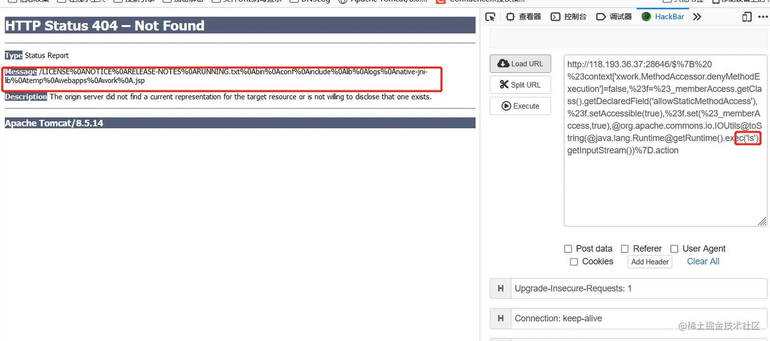 如果请求不匹配任何其他定义的动作,它将被匹配*并且请求的动作名称将用于根据动作名称加载 JSP 文件。并且由于 { 1} 的值被威胁为 OGNL 表达式,因此允许在服务器端执行任意 Java 代码。这个漏洞是两个问题的结合: