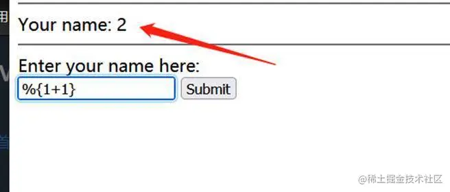 在框中输入 %{1+1} ,回显值 2,说明执行成功
