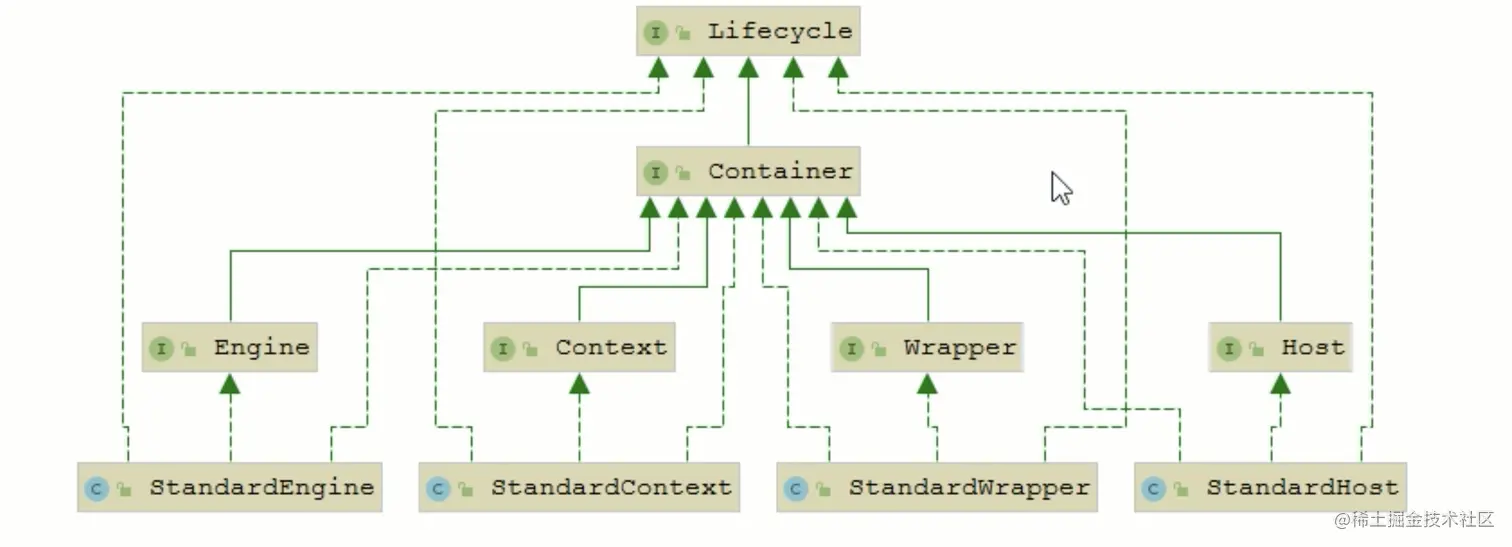 Container 接口扩展了 LifeCycle 接口,LifeCycle 接口用来统一管理各组件的生命周期