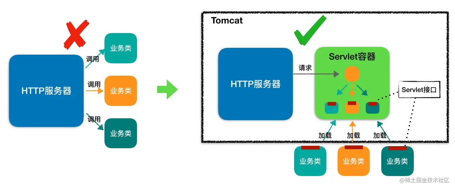 图的左边表示 HTTP 服务器直接调用具体业务类,它们是紧耦合的。再看图的右边,HTTP 服务器不直接调用业务类,而是把请求交给容器来处理,容器通过 Servlet 接口调用业务类。因此 Servlet 接口和 Servlet 容器的出现,达到了 HTTP 服务器与业务类解耦的目的。 服务器不直接调用业务类,而是把请求直接交给容器来处理,容器通过Servlet接口调用业务类。因此Servlet接口和Servlet容器的出现,是用来解耦HTTP服务器和业务类。Servlet容器和Servlet接口这一套规范叫做Servlet规范。