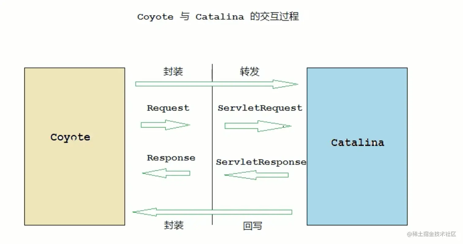 Coyote作为独立的模块,只负责具体协议和IO的相关操作,与 Servlet规范实现没有直接关系,因此即便是Request和 Response对象也并未实现Servlet规范对应的接口,而是在Catalina 中将他们进一步封装为ServletRequest和ServletResponse