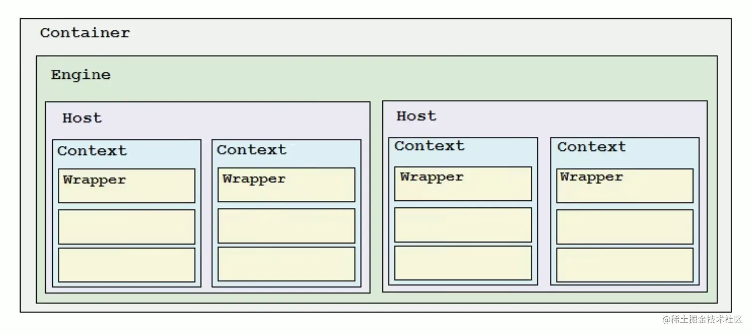 从图上你可以看到,最顶层是 Server,这里的 Server 指的就是一个 Tomcat 实例。一个 Server 中有一个或者多个 Service,一个 Service 中有多个连接器和一个容器。连接器与容器之间通过标准的 ServletRequest 和 ServletResponse 通信。