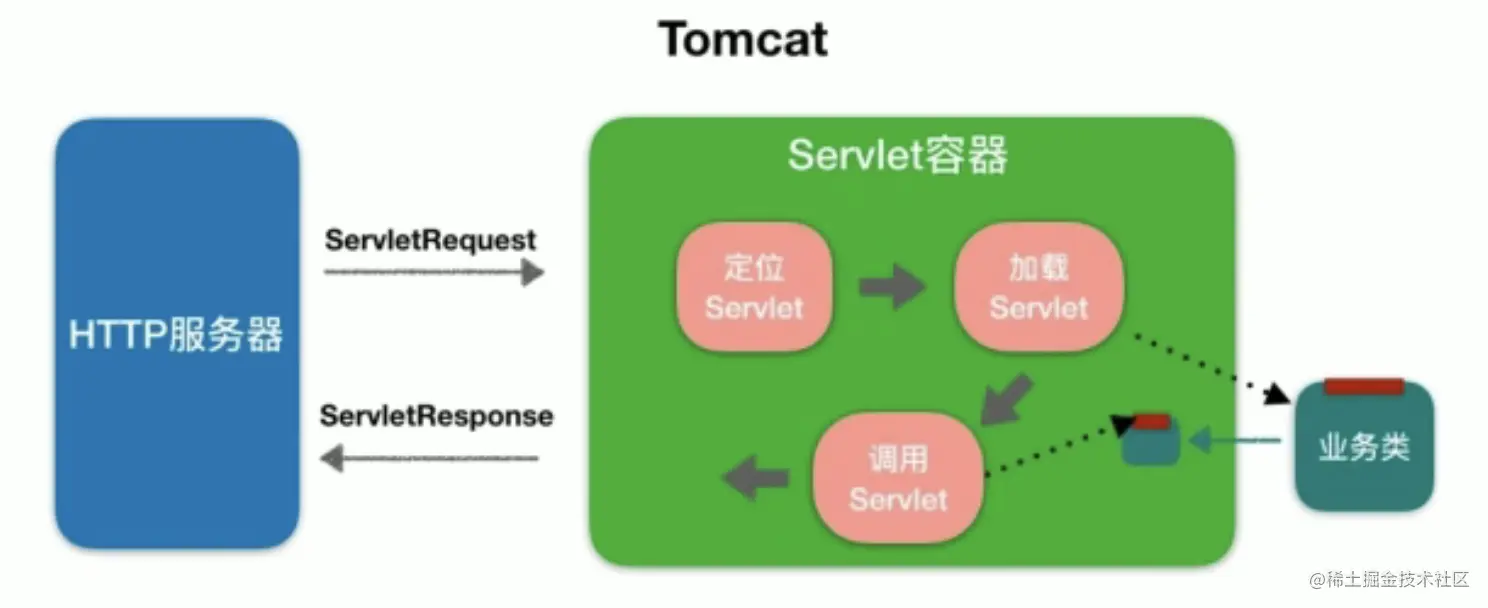 浏览器发给服务端的是一个 HTTP 格式的请求,HTTP 服务器收到这个请求后,需要调用服务端程序来处理,所谓的服务端程序就是你写的 Java 类,一般来说不同的请求需要由不同的 Java 类来处理。