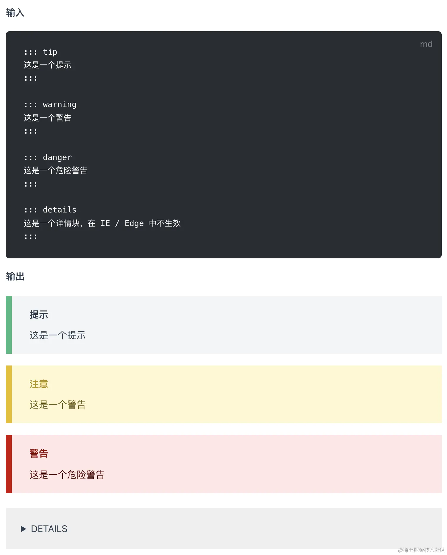 注意这其中的 ::: 是插件定义的语法,它会取出 ::: 后的字符,在这个例子中是 warning,并提供方法自定义渲染结果: