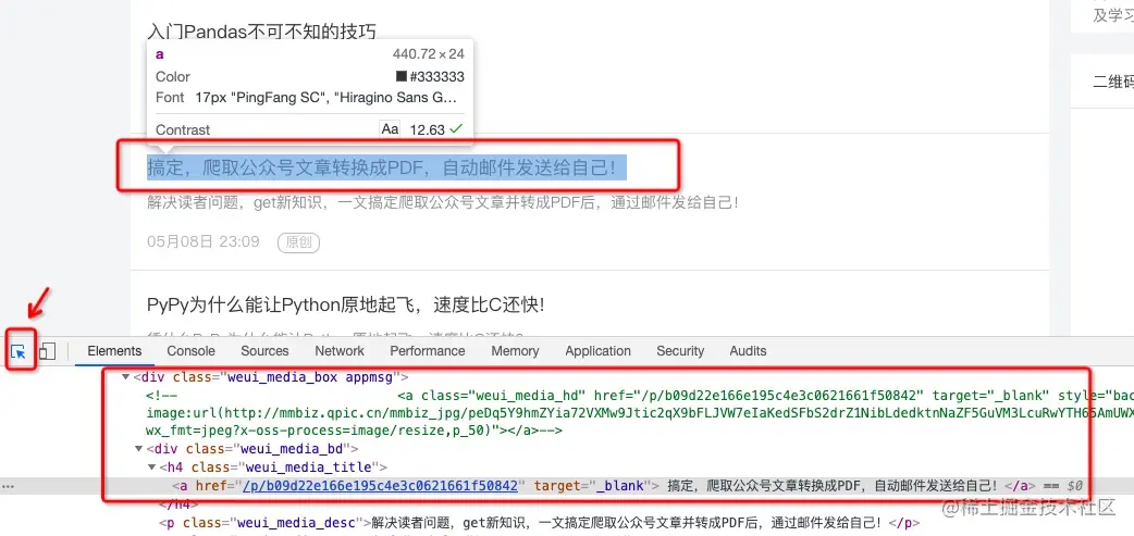 在页面中,我们按住F12,调出浏览器的开发者工具,点击左上角的元素选择器,然后随便选择页面中的一个文章标题,选中后,开发者工具中的Elements会自动跳动到对应的页面源码处,如下图所示: