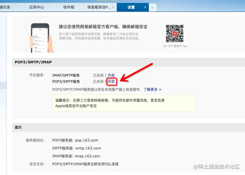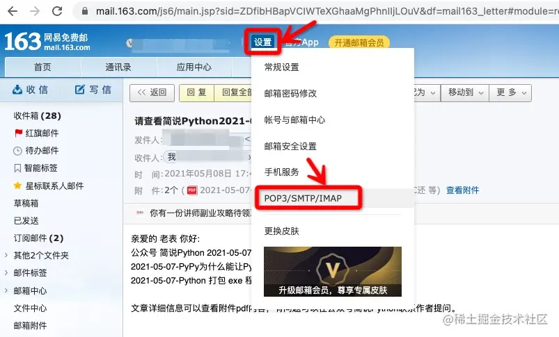 这里需要注意的是,代码里的user就是你的邮箱地址,比如1234567@163.com,password不是你的邮箱密码,而是你在邮箱页面开启POP3/SMTP服务后,系统给到的一个码,下面以163邮箱为例子给大家介绍如何获取这个password。