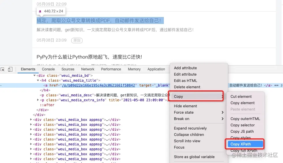选中源码中对应内容,右键,选择Copy中的Copy XPath,即可复制出对应元素对应的XPath路径。