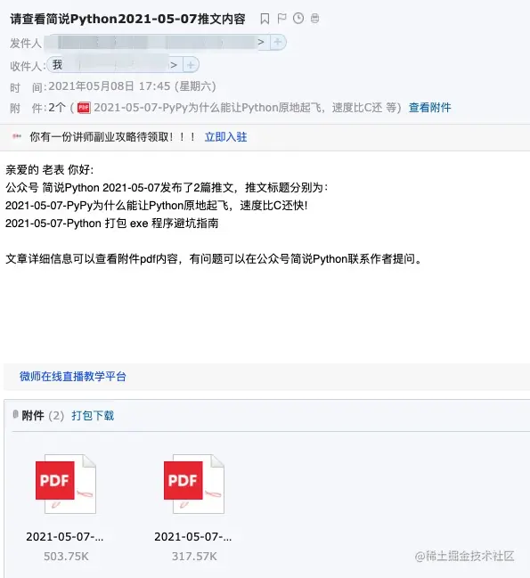 今天给大家分享如何每天定时爬取公众号文章链接和标题,并将内容转换成PDF,以附件的形式通过邮件发送给自己的小技巧(脚本)。