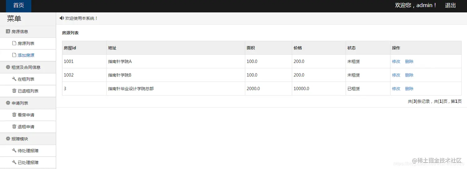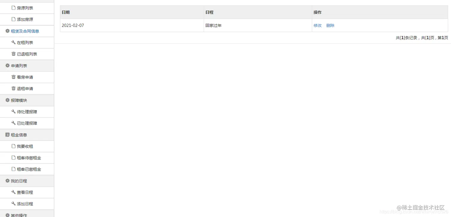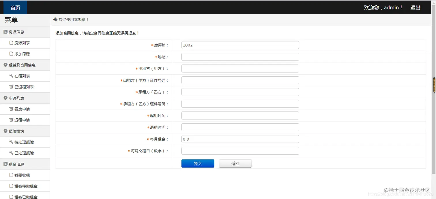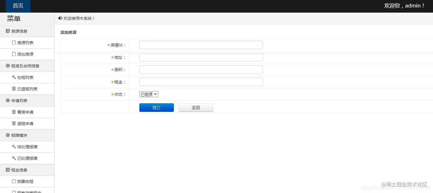 物业管理员登陆:可以实现房屋信息管理,租赁和合同信息管理,申请租赁房屋管理,租金管理,日程管理,租赁用户管理,故障报修管理。