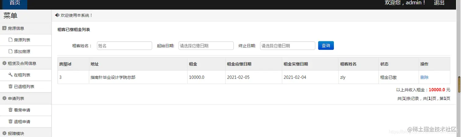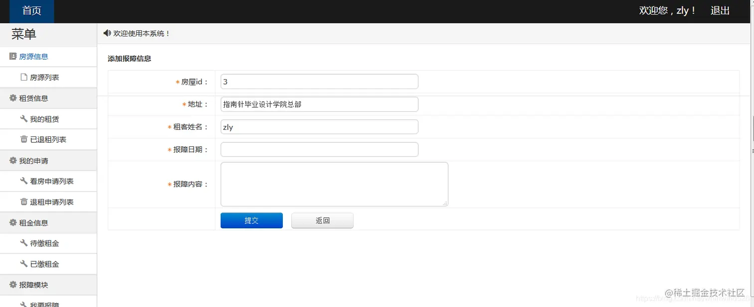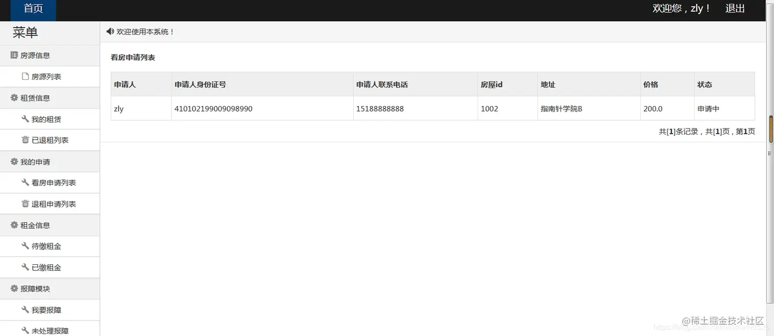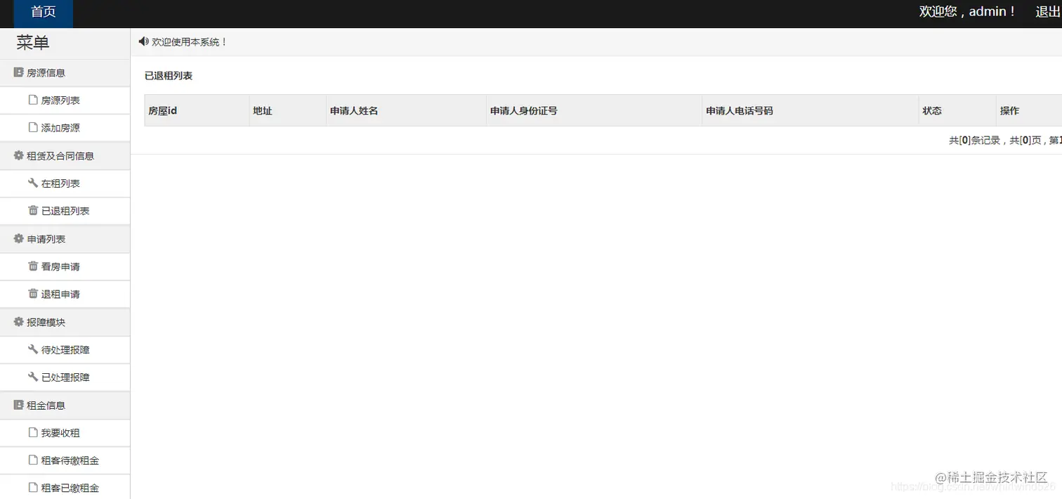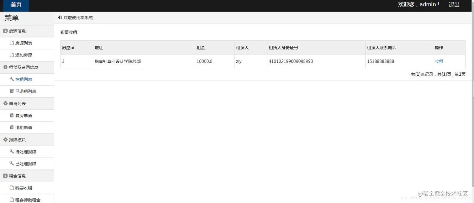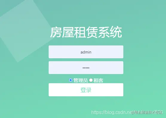 租客登陆:可以查询房屋信息,申请租赁,管理个人租赁信息,申请退租,管理租金,故障报修,完善个人信息。