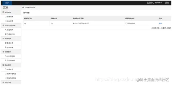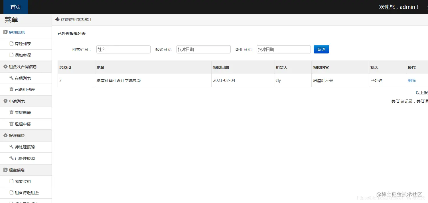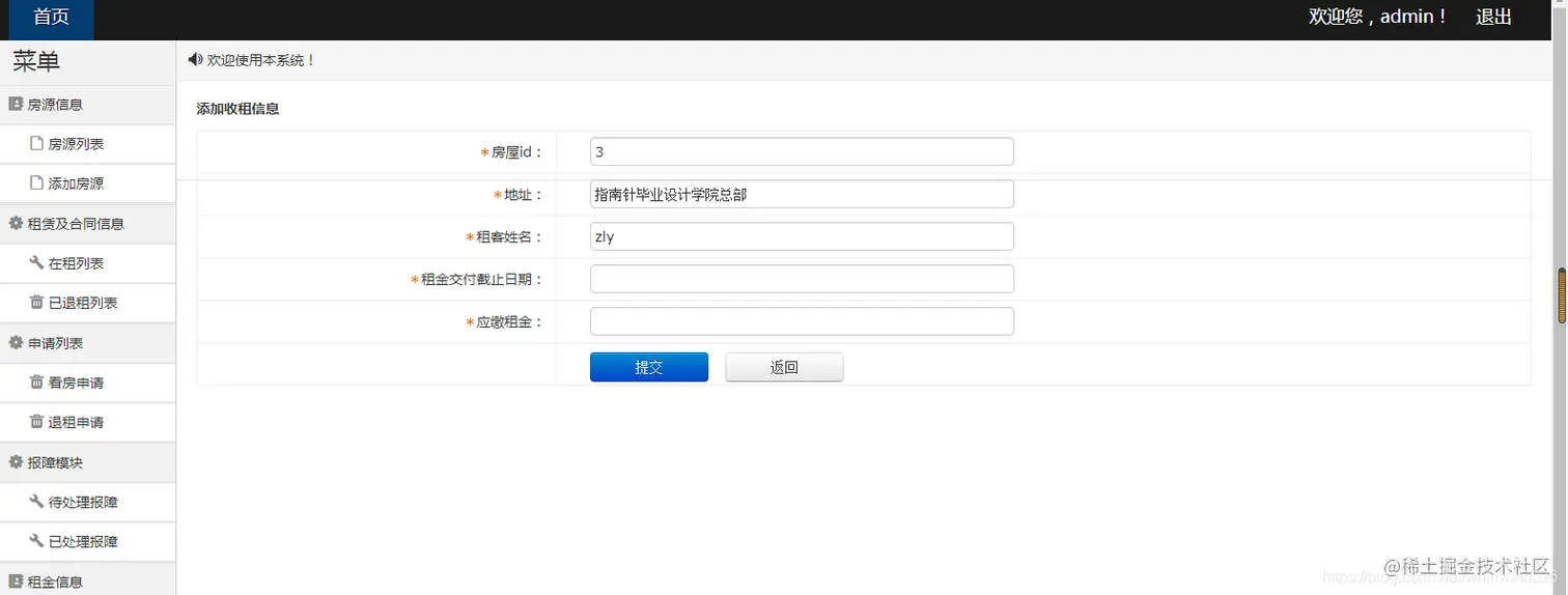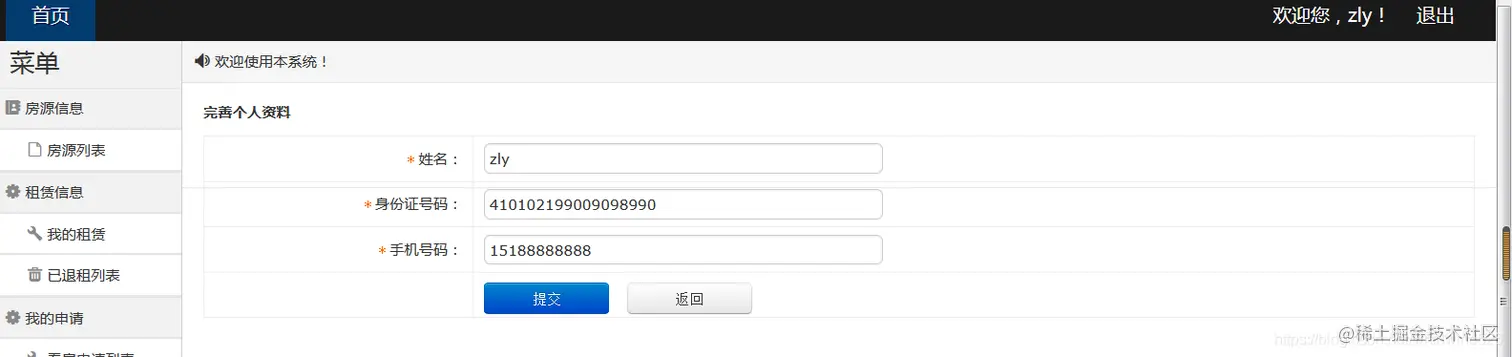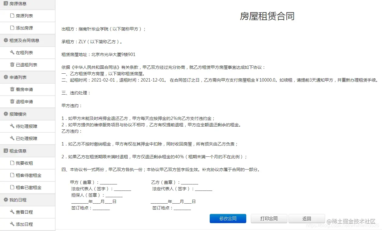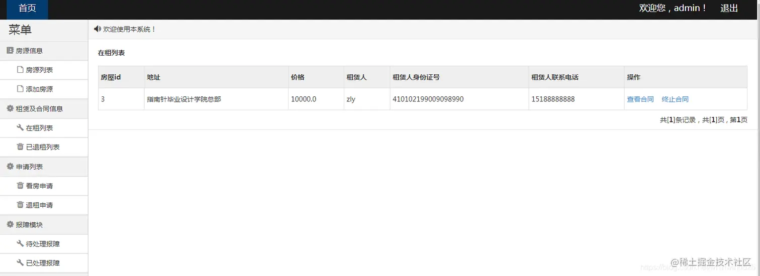租客登陆:可以查询房屋信息,申请租赁,管理个人租赁信息,申请退租,管理租金,故障报修,完善个人信息。