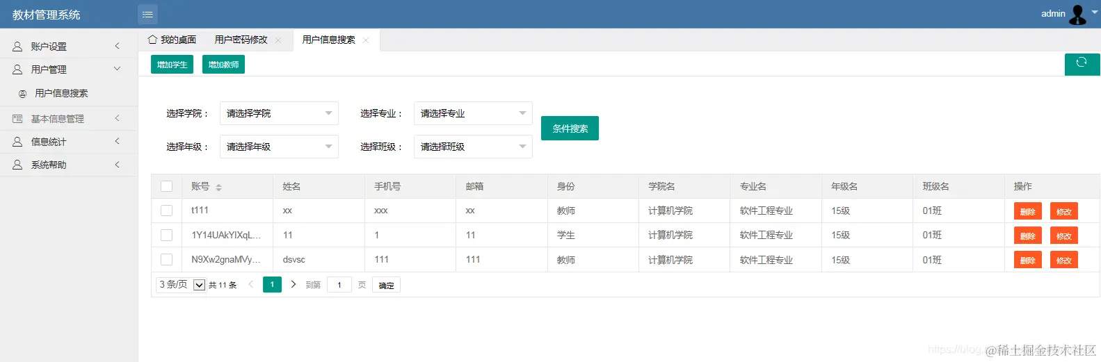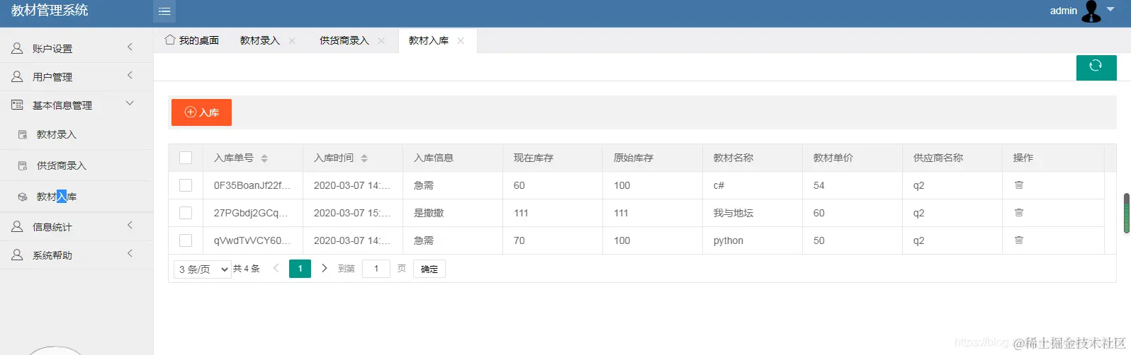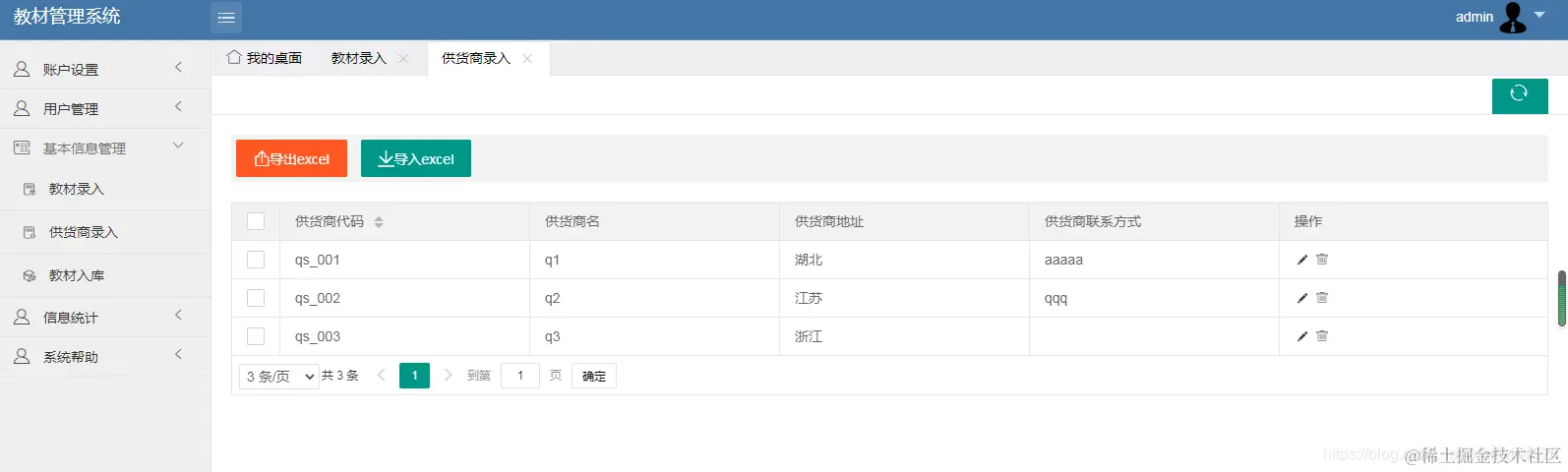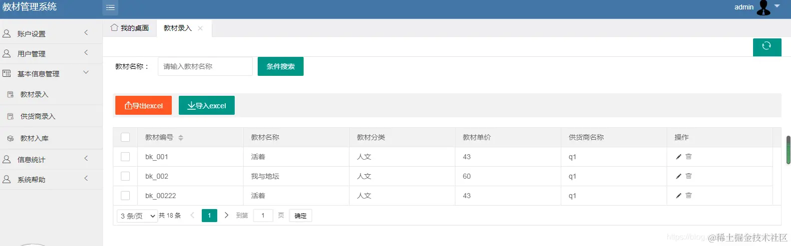 管理员可以增删改查教材、教材商、入库教材、用户(用户包括学生和教师)可以对教材商、教材进行excel的导入导出操作。