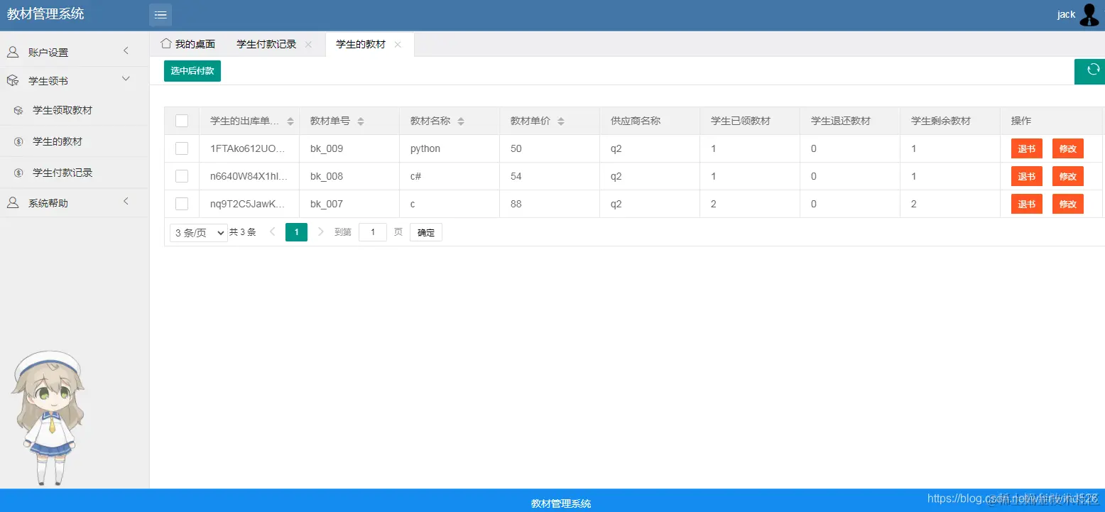 学生只能在对应的教师那里领取教材,并且可以退还教材、查询自己已经领取的教材。并且对已领教材付款。