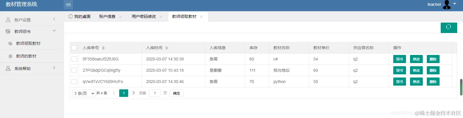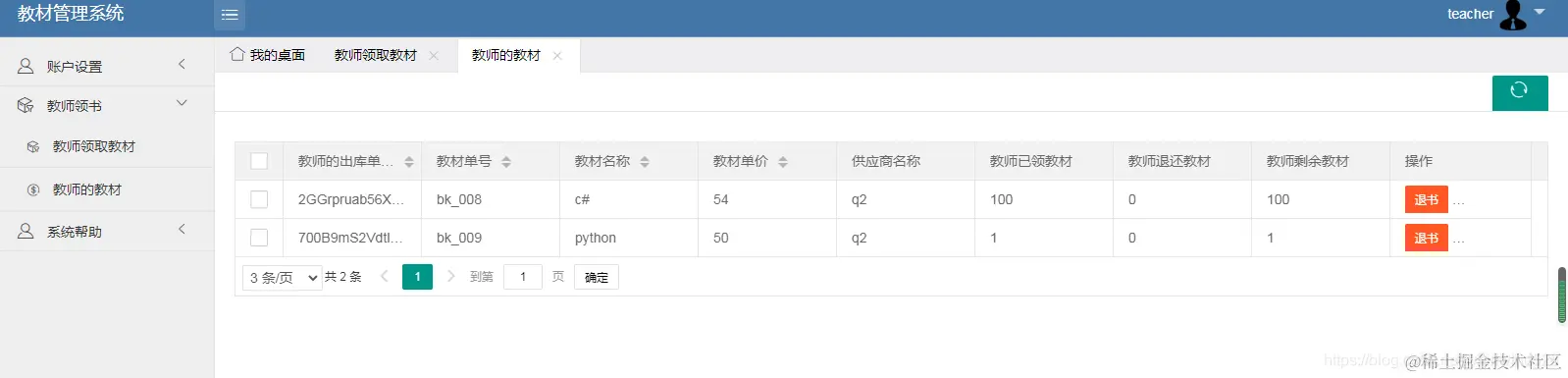 教师可以领取入库的教材,可以退还教材。