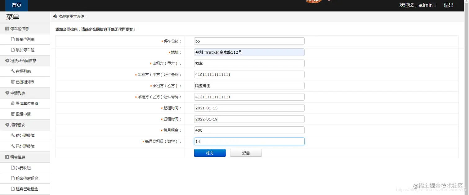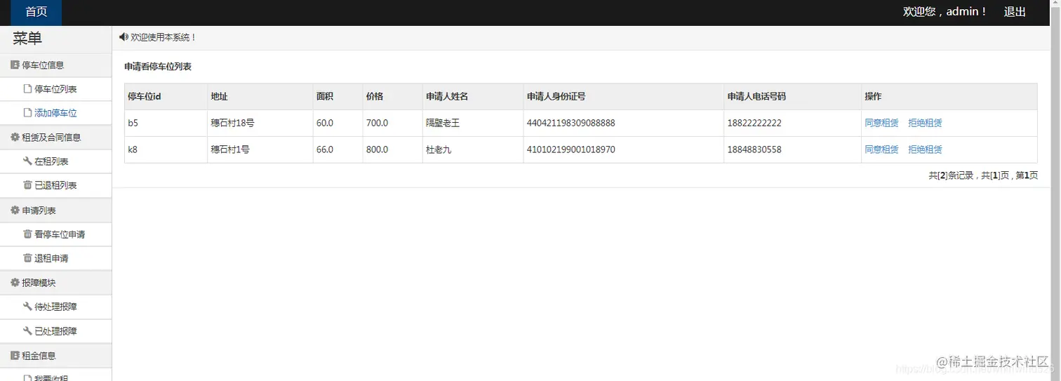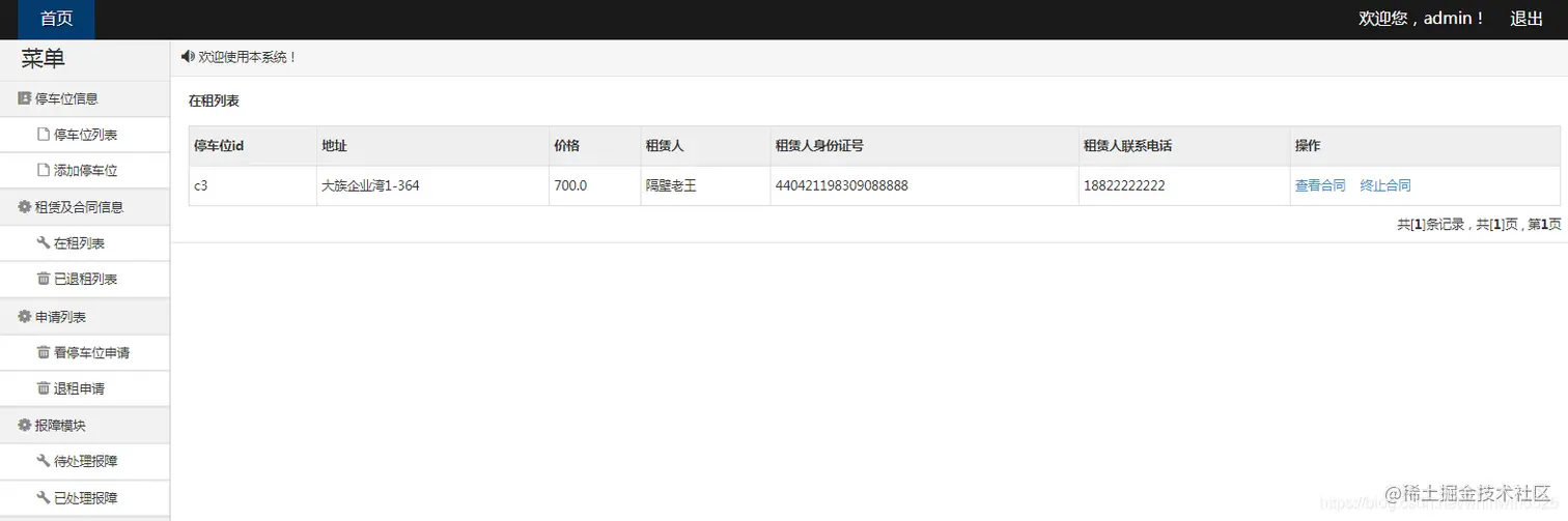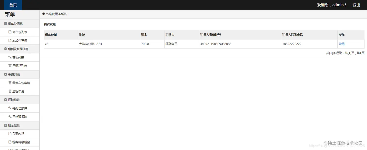租客登陆:可以查询停车位信息,申请租赁,管理个人租赁信息,申请退租,管理租金,故障报修,完善个人信息。
