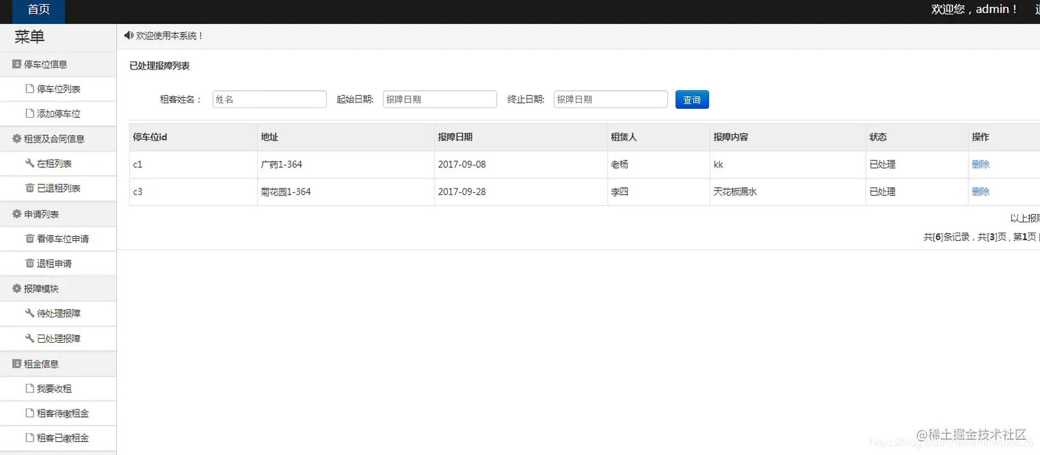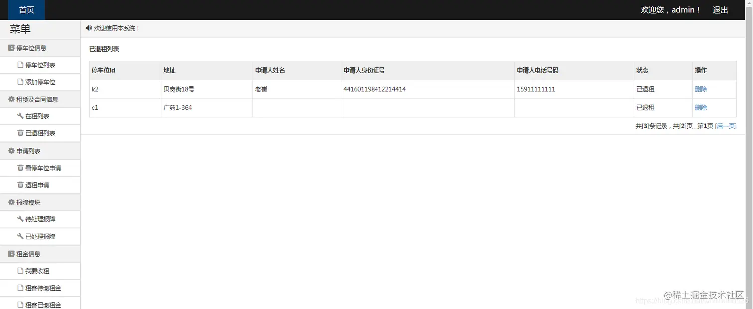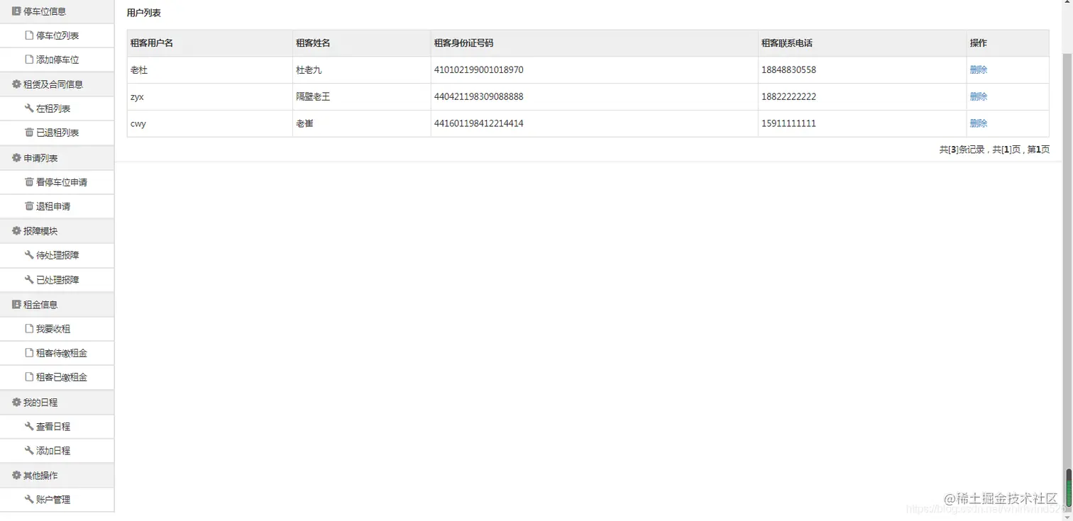租客登陆:可以查询停车位信息,申请租赁,管理个人租赁信息,申请退租,管理租金,故障报修,完善个人信息。
