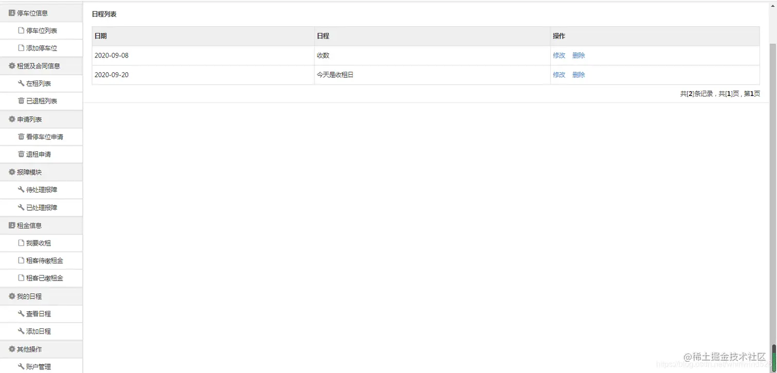 物业管理员登陆:可以实现停车位信息管理,租赁和合同信息管理,申请租赁车位管理,租金管理,日程管理,租赁用户管理,故障报修管理。