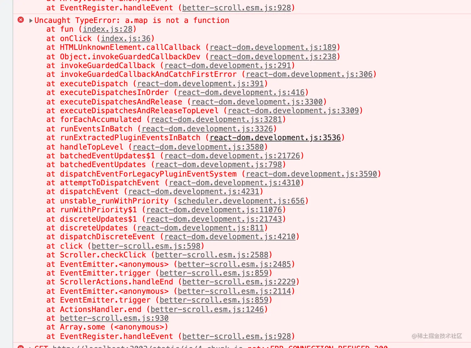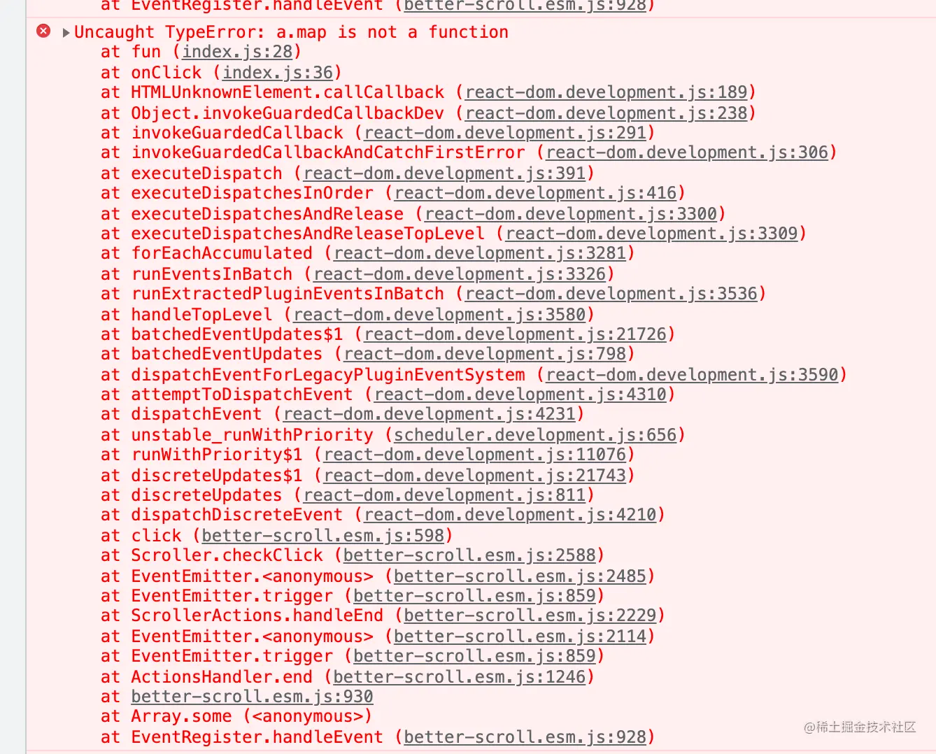 这种报错我们在开发过程中经常会遇到,这其实就是一个错误的堆栈,栈顶是具体报错的信息,此时我们会发现后面的小括号里给我们提示了 (index.js: 28) ,我们点进去看