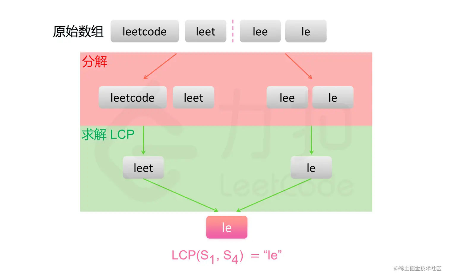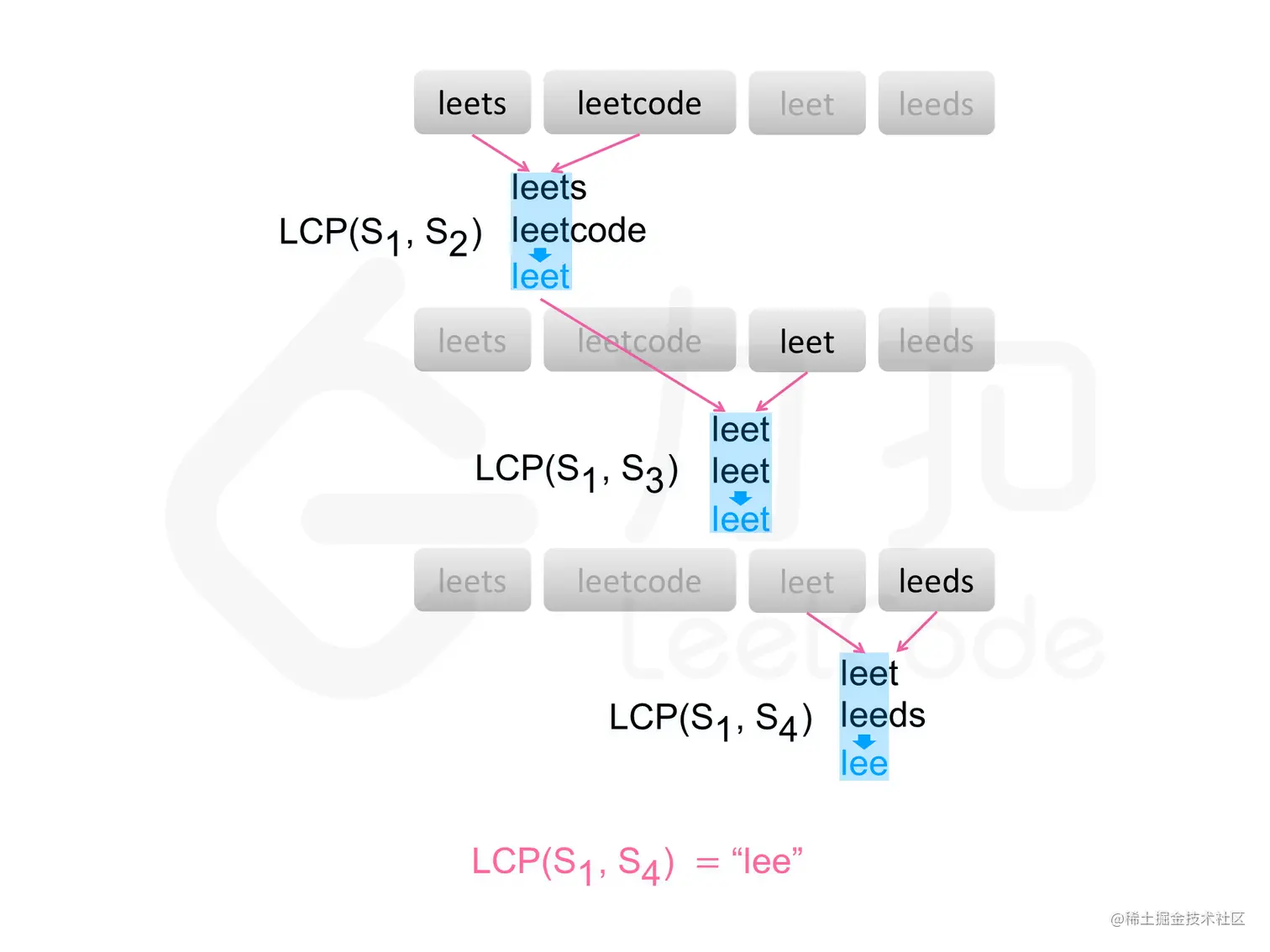 首先求出前两个字符串的最长公共前缀,然后求出其 (前两者的最长公共前缀) 与第三个字符串的最长公共前缀,对于每个遍历到的字符串,就更新一次最长公共前缀。直到遍历完所有字符串,即可得到字符串数组中的最长公共前缀了。