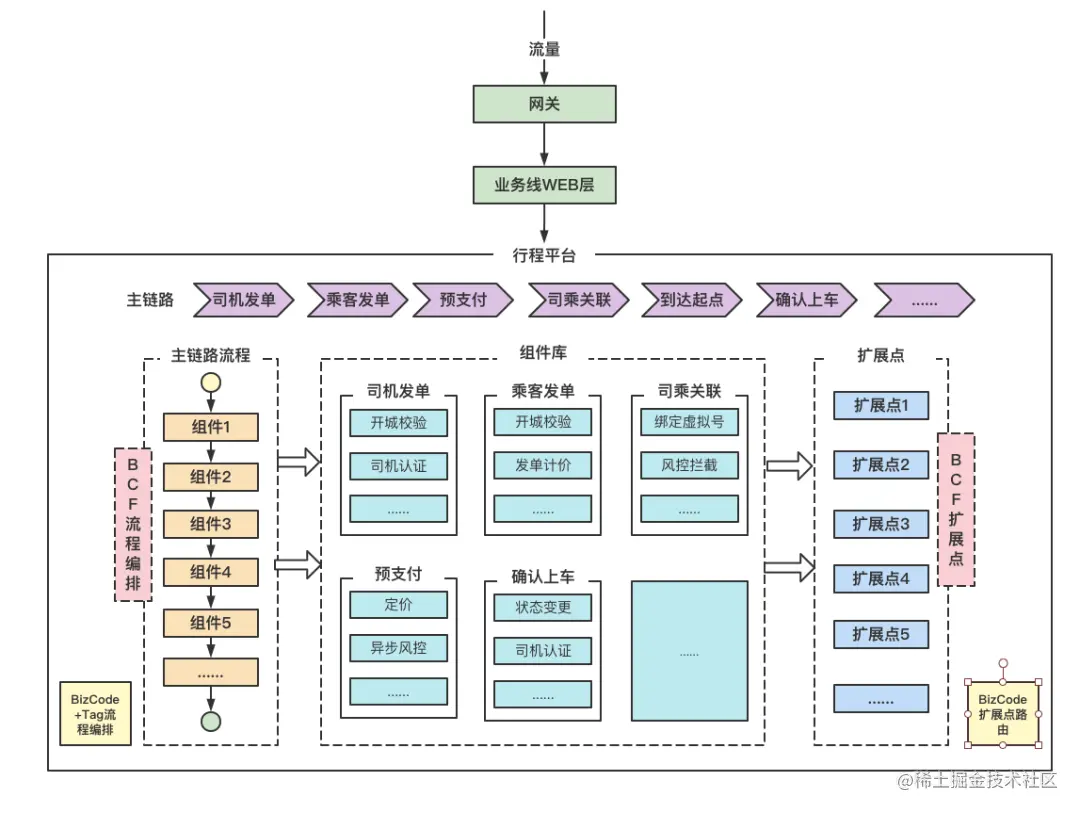 原子组件内部之间的差异通过BCF扩展点进行代码的隔离和差异的开发。业务中台通过组建对接业务线,业务线通过业务特性可对行程平台的组件进行编排。