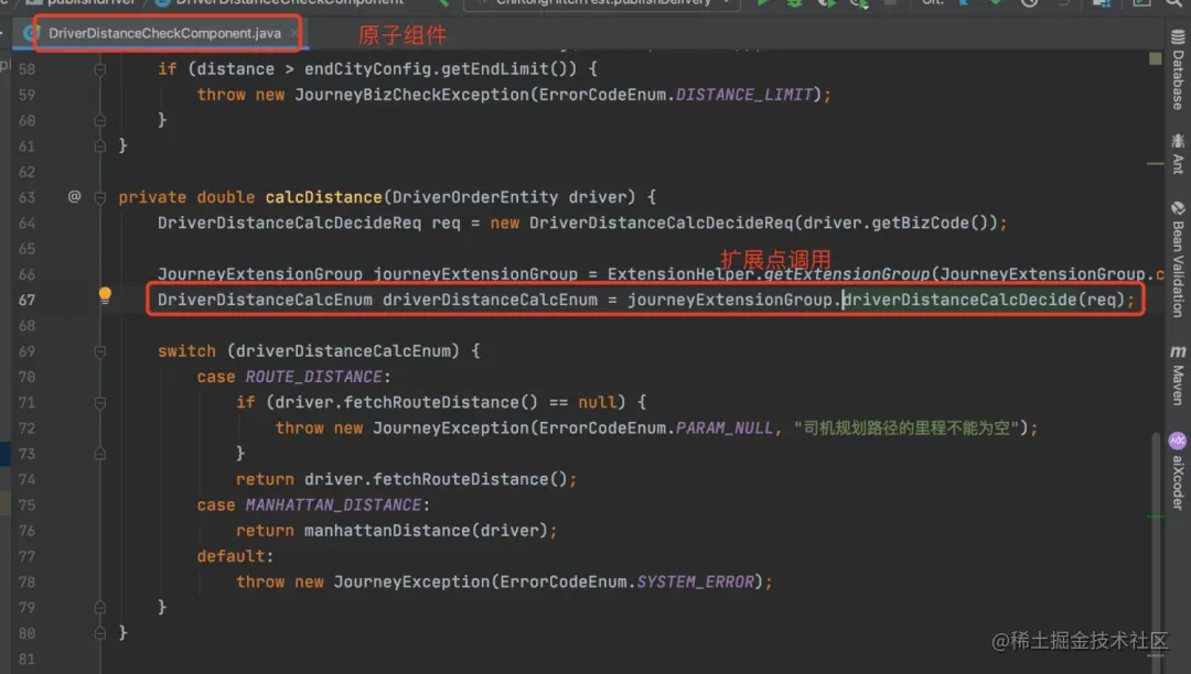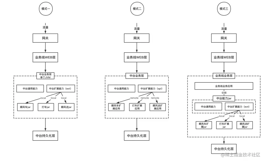 中台业务逻辑层只定义扩展的spi,所有的扩展点业务逻辑实现都在业务方的单独应用进行实现。中台逻辑调用扩展点是远程调用。