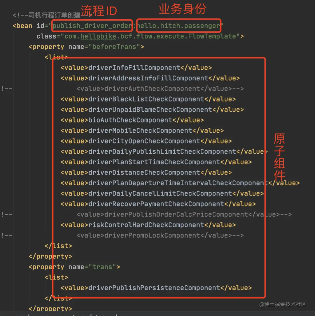 行程平台基于原子组件和BCF流程编排,对原子组件进行编排,从而组合成为一个个组件(如:开城校验原子组件+司机认证原子组件+其他多个原子组件,编排为司机发单组件)。