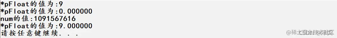 - 可能会有些小伙伴有些疑问,为什么第二行运行结果的*pFloat的答案是:0.000000,还有第三行的num的运行结果是:1091567616,我觉得因该是 9.000000 和 9啊。好,别着急现在就来说说为什么!