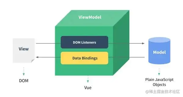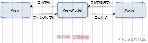 MVVM 是 vue 实现数据驱动视图和双向数据绑定的核心原理。MVVM 指的是 Model、View、ViewModel,它把每个 HTML 页面都拆分成了这三个部分,如图所示: