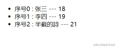 <li v-for='(item, index) in list' :key='item.id'>序号{{ index }} : {{ item.name }} --- {{ item.age }}</li>