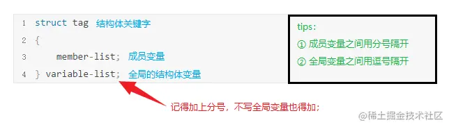 ② 结构体末大括号后 必须加上分号(即使不写全局变量也要加上);