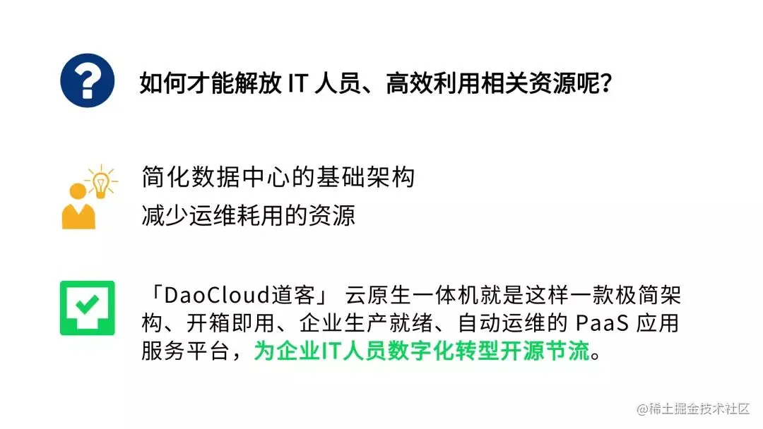 「DaoCloud 道客」 耗时数年倾力打造的云原生一体机,以容器应用云为核心,久经金融生产验证,可以快速搭建现代化分布式数据中心。既能实现海量应用的全生命周期管理,在企业异构基础设施和多云/混合云环境中,实现应用的统一开发、运营和维护管理。又能适配主流操作系统和硬件资源,搭建统一数据存储服务,实现高性能本地存储和网络存储,构建 Parcel 智能网络规划。用 OpenAPI 扩展应用能力,标准化应用开发交付,实现整个应用集群的自动化运维。模块化搭建的云原生一体机采用极简架构,自带云原生容器化平台,与传统数据中心的三层构建方法相比,每年可以节省至少 50% 的总拥有成本。